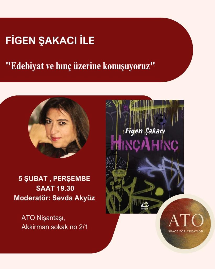 Sevilen yazar Figen Şakacı, ATO Nişantaşı’na konuk oluyor. 5 Şubat perşemebe akşamı saat 19.30’da Sevda Akyüz moderatörlüğünde gerçekleşecek olan söyleşide Figen şakacı ile “edebiyat ve hınç üzerine” konuşulacak.
