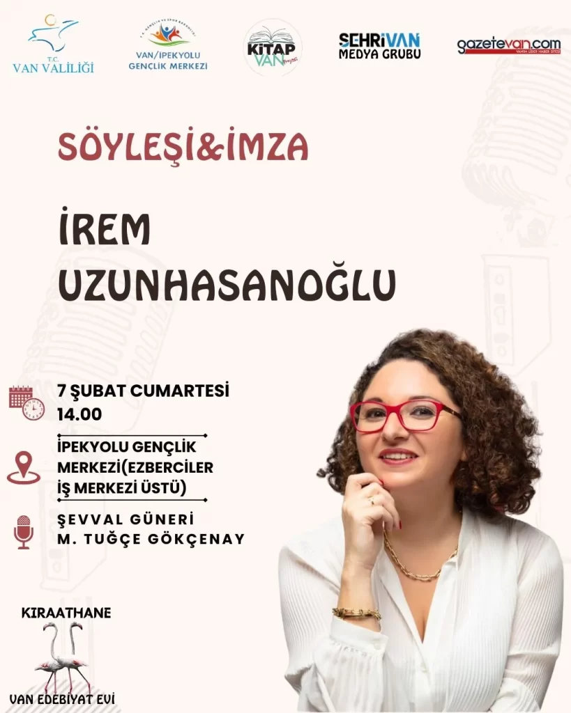 İrem Uzunhasanoğlu, 7 Şubat Cumartesi günü Van Kıraathane Edebiyat Evi’nin düzenlediği söyleşi kapsamında İpekyolu Gençlik Merkezi’nde Vanlı okurlarla bir araya gelecek.