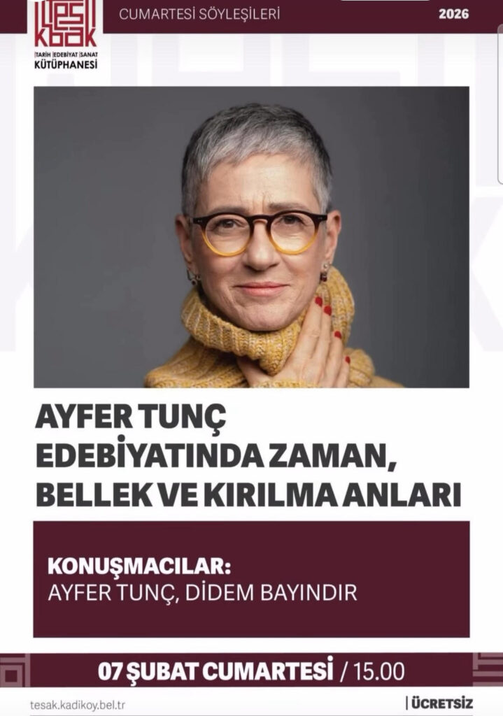 Cumartesi Söyleşileri kapsamında sizi, çağdaş edebiyatımızın güçlü kalemlerinden Ayfer Tunç ile edebiyatında belirleyici bir eksen olan zaman, bellek ve kırılma anları üzerine düşünmeye davet ediyoruz.