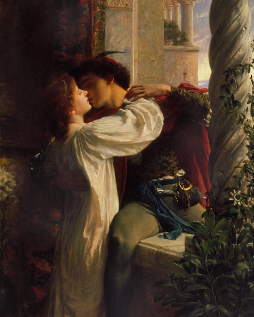 Şimdiye kadar anlatılmış en büyük aşk hikayelerinden biri, Shakespeare’in Romeo ve Juliet adlı eseridir. İlk kez 1597’de yayınlanan bu trajik genç aşıklar hikayesi, tiyatro sahnelerinde, filmlerde ve sanat eserlerinde birçok şekilde sergilenmiştir. Frank Bernard Dicksee’nin 1884 yılında yaptığı ve Southampton Şehir Sanat Galerisi’nde sergilenen ünlü bir tablo vardır. Tablo, Romeo’nun balkondan ayrılmadan hemen önceki anı, bacağını balkondan sarkıtmış halde Juliet ile öpüşürken gösterir. Bu sahne, aşklarının aciliyetini ve güçlü duygularını yansıtır.