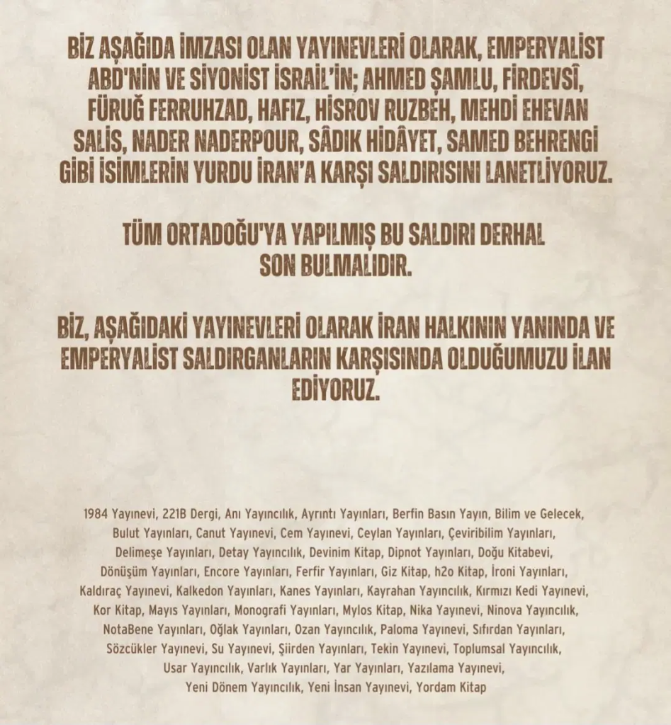 “Biz aşağıda imzası olan yayınevleri olarak, emperyalist ABD’nin ve siyonist İsrail’in; Ahmed Şamlu, Firdevsî, Füruğ Ferruhzad, Hafız, Hisrov Ruzbeh, Mehdi Ehevan Salis, Nader Naderpour, Sâdık Hidâyet, Samed Behrengi gibi isimlerin yurdu İran’a karşı saldırısını lanetliyoruz.